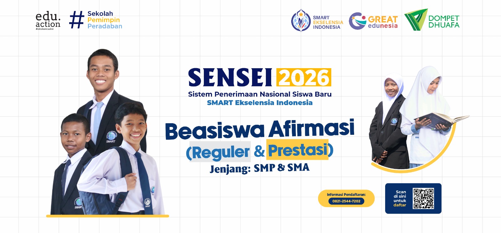 Pada Tahun Ajaran 2026/2027, SMART Ekselensia Indonesia membuka kesempatan calon peserta didik putra maupun putri dengan jalur beasiswa dan mandiri. Selain itu, khusus jenjang SMP dan SMA, kami juga membuka pilihan dengan sistem Boarding School atau Full Day School. Hal ini dilakukan guna membuka ruang dan memberikan kesempatan bagi semua masyarakat untuk belajar bersama dan berbagi kebermanfaatan dengan mereka yang mendapatkan beasiswa, serta mengedepankan inklusivitas sekolah.