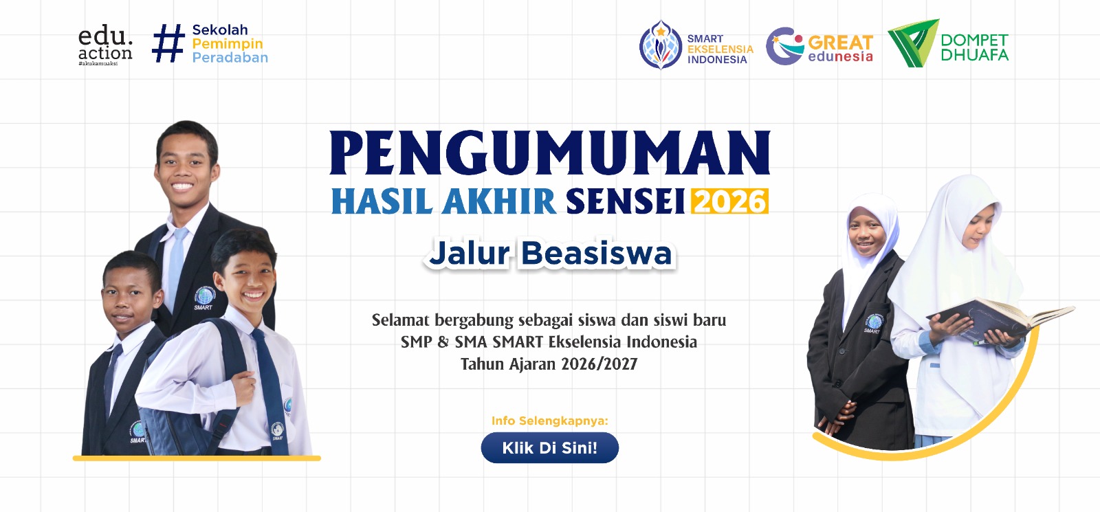 Pada Tahun Ajaran 2026/2027, SMART Ekselensia Indonesia membuka kesempatan calon peserta didik putra maupun putri dengan jalur beasiswa dan mandiri. Selain itu, khusus jenjang SMP dan SMA, kami juga membuka pilihan dengan sistem Boarding School atau Full Day School. Hal ini dilakukan guna membuka ruang dan memberikan kesempatan bagi semua masyarakat untuk belajar bersama dan berbagi kebermanfaatan dengan mereka yang mendapatkan beasiswa, serta mengedepankan inklusivitas sekolah.